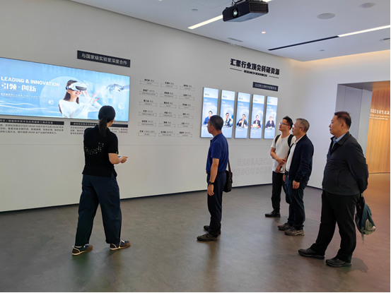 活动的第一部分是参观调研国家虚拟现实创新中心。与会人员详细了解了中心在虚拟现实技术研发、创新应用等方面的最新成果及发展规划。接着,严小天总经理介绍了国创中心的主要情况,强调了虚拟现实产业未来的巨大潜力和技术前沿。李晓波副总经理则分享了虚拟现实技术在各行业的应用前景,并展示了中心在推动虚拟现实产业创新方面的成就。随后,太阳成集团tyc33455cc智能学院的马礼书记代表学院介绍了在虚拟现实领域的教学和科研进展,展示了学院在数字媒体技术和虚拟现实技术融合方面的最新成果。